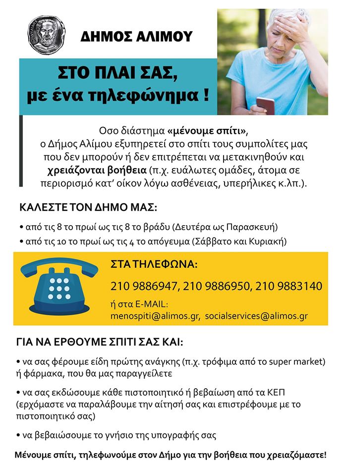 Από σήμερα και για όσο χρειαστεί να «μένουμε σπίτι» για την προστασία της υγείας όλων μας από την πανδημία, ο Δήμος Αλίμου θα εξυπηρετεί στο σπίτι τους συμπολίτες μας που δεν μπορούν ή δεν επιτρέπεται να μετακινηθούν και χρειάζονται βοήθεια (π.χ. ευάλωτες ομάδες, άτομα σε περιορισμό κατ’ οίκον λόγω ασθένειας, υπερήλικες κ.λπ.).