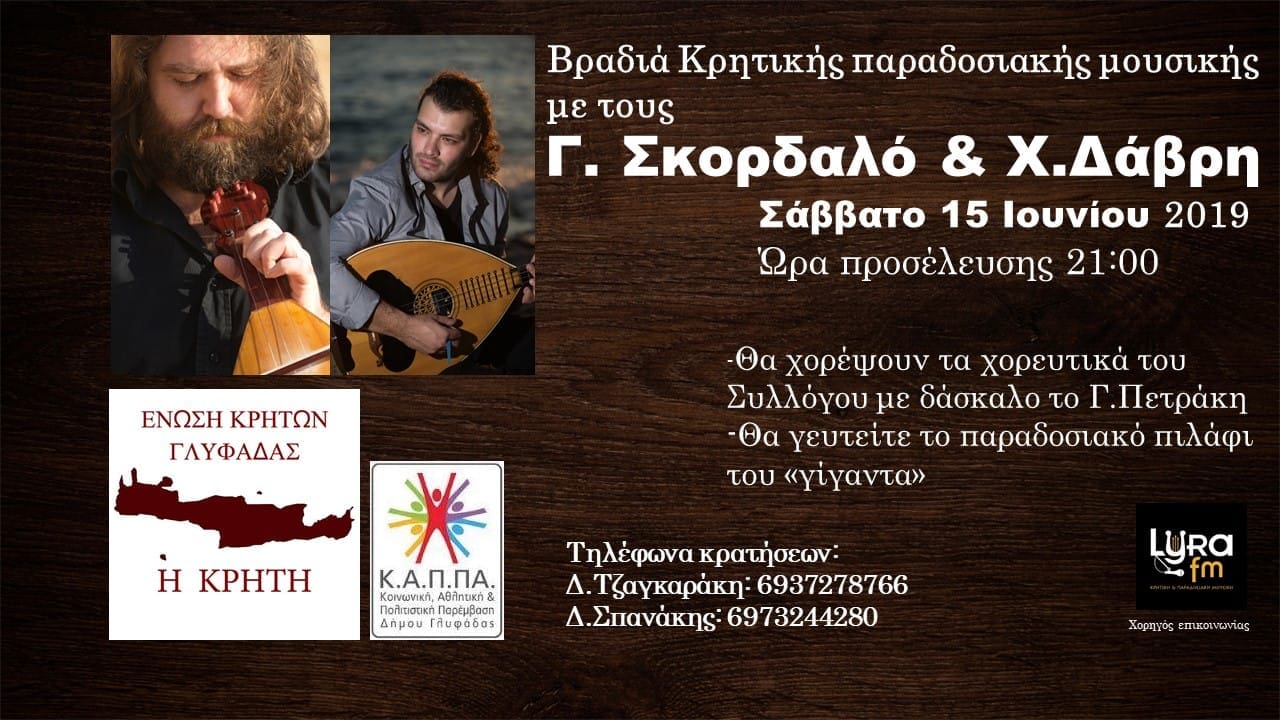 Η Ένωση Κρητών Γλυφάδας «Η Κρήτη», σε συνεργασία με το ΚΑΠΠΑ του Δήμου Γλυφάδας, διοργανώνει βραδιά κρητικής, παραδοσιακής, μουσικής από το συγκρότημα του Γ. Σκορδαλού και του Χ. Δάβρη.