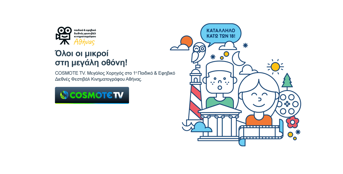 Η COSMOTE TV στηρίζει, ως Μεγάλος Χορηγός, το 1ο Παιδικό & Εφηβικό Φεστιβάλ Κινηματογράφου Αθήνας, το οποίο ανοίγει για πρώτη φορά τις πόρτες του την Παρασκευή 7 Δεκεμβρίου, στο Μέγαρο Μουσικής Αθηνών, και θα διαρκέσει έως την Κυριακή 9 Δεκεμβρίου.