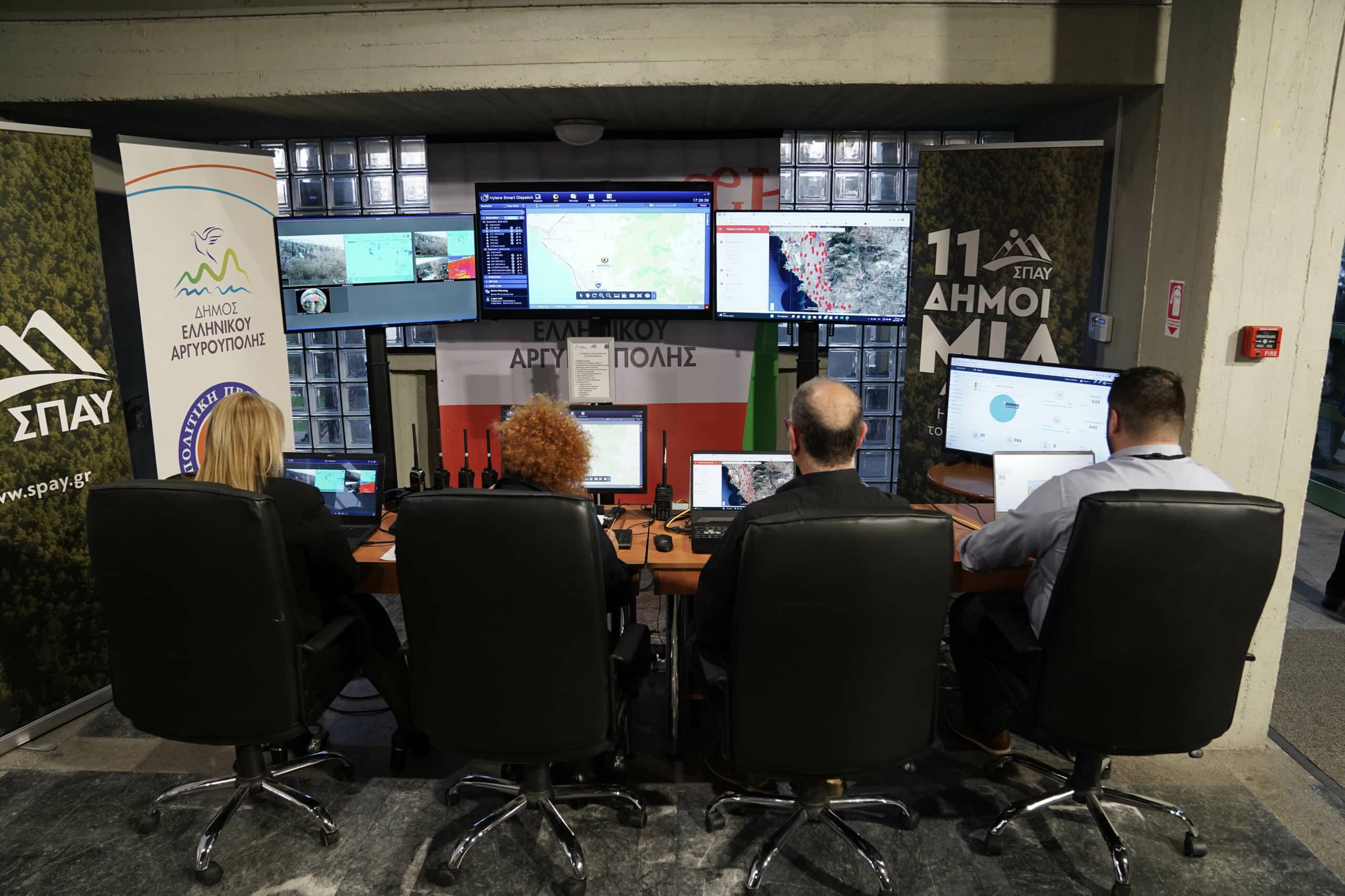 Σε ζωντανή σύνδεση παρουσιάστηκε η μικρογραφία του Κέντρου Διαχείρισης Κρίσεων που είχε στηθεί στο φουαγιέ για να περιγράψει σε πραγματικό χρόνο πως λειτουργεί σε αναμονή αλλά και σε κάποιο συμβάν.