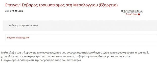 «Μολις ελαβα ενα τηλεφωνημα απο συντροφο,οπου μου ανεφερε οτι στη Μεσολλογιου εγινα καποιες συγκρουσεις κι ενα παιδι χτυπηθηκε απο πλαστικη σφαιρα μπατσου και ειναι παρα πολυ σοβαρα ,εφτασε ασθενοφορο και το πανε στον Ευαγγελισμο..Διασταυρωστε την πληροφορια εσεις που ειστε αθηνα».