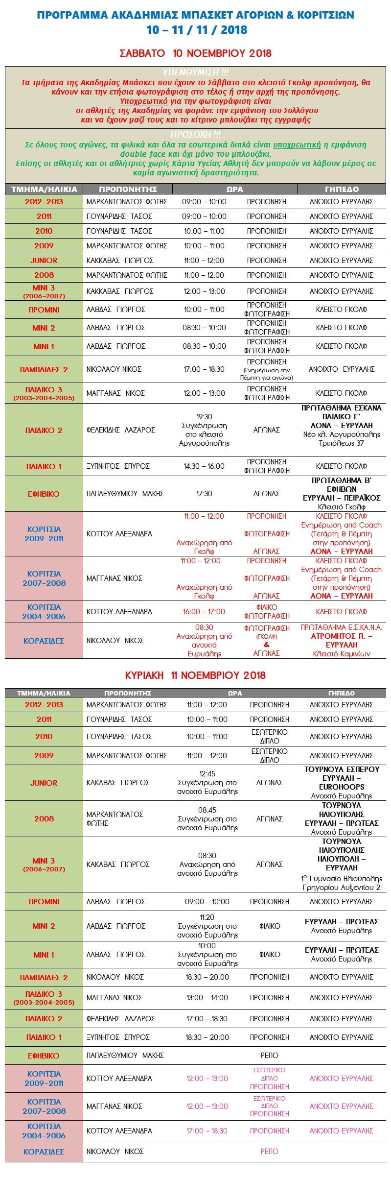 «Α.Γ.Ο.Γ. ΕΥΡΥΑΛΗ» – Μπάσκετ-Πρόγραμμα προπονήσεων Ακαδημίας Αγοριών & Κοριτσιών 10 – 11 / Νοεμβρίου / 2018