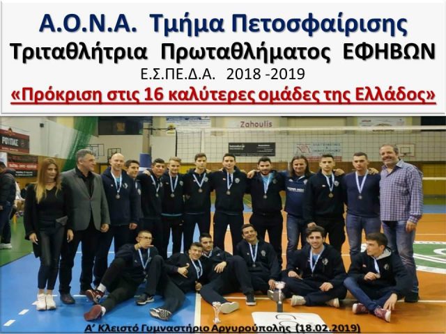 Με τον Παναθηναϊκό, τον Ολυμπιακό και τον Απόλλων Πατρών κληρώθηκε η ομάδα των Εφήβων μας, στον Γ όμιλο του Πανελληνίου πρωταθλήματος  Πετοσφαίρισης, για την φάση των 16 καλύτερων ομάδων στην Ελλάδα.