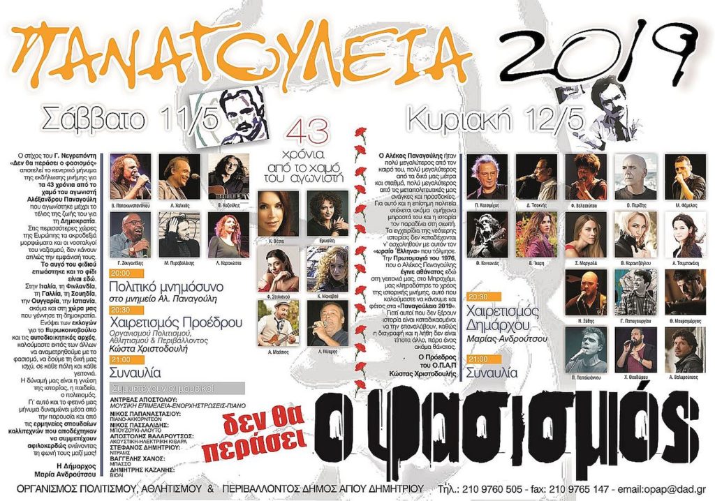 Στην πλατεία Αλέξανδρου Παναγούλη (Σταθμός Μετρό ΑΓΙΟΣ ΔΗΜΗΤΡΙΟΣ ), το Σάββατο 11 και την Κυριακή 12 Μαΐου και ώρα 20:30, τραγουδάμε ενάντια στο φασισμό με μεγάλους καλλιτέχνες.