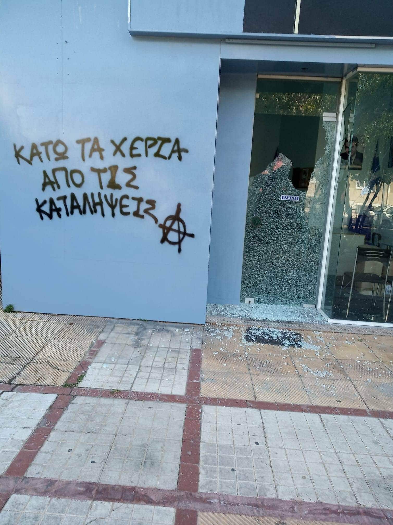Οι άγνωστοι δράστες έσπασαν τον υαλοπίνακα της πρόσοψης των γραφείων, που βρίσκονται στο ισόγειο, πιθανότατα με μία παλέτα που βρέθηκε στο σημείο.