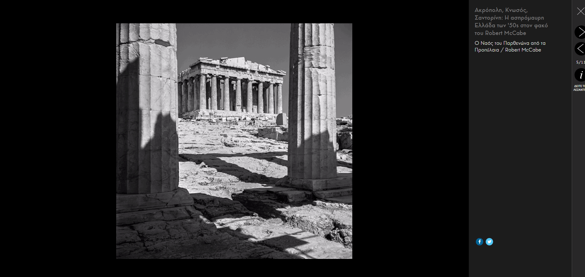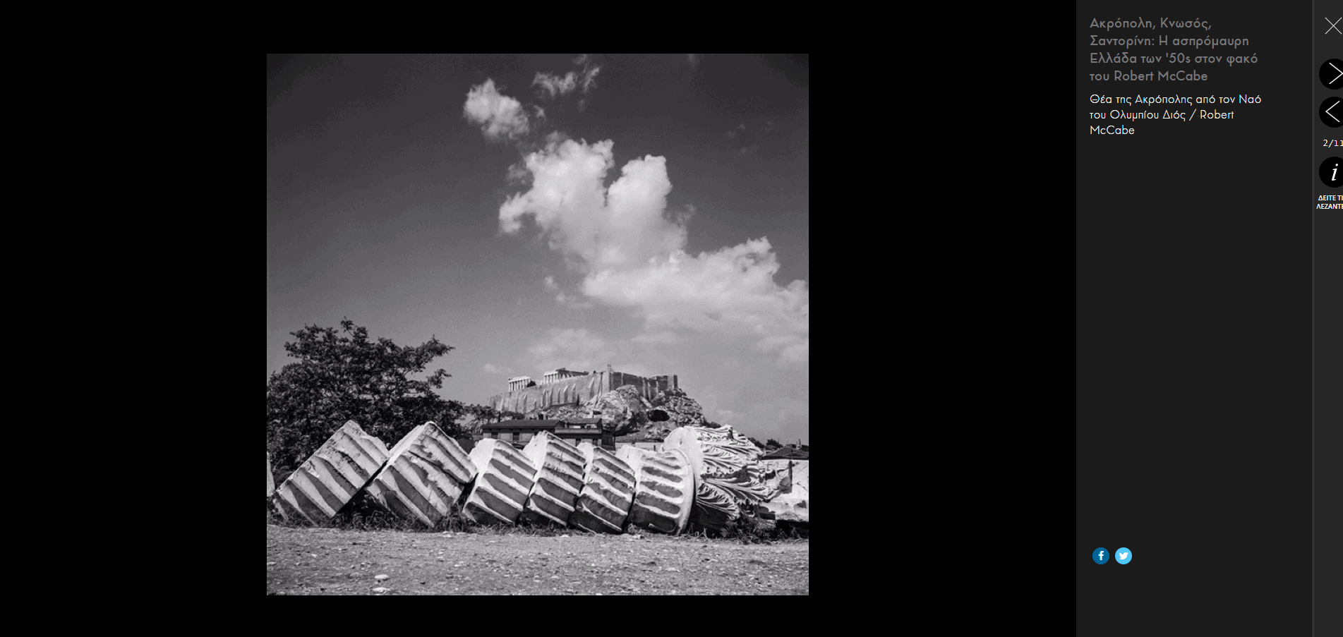 Θέα της Ακρόπολης από τον Ναό του Ολυμπίου Διός / Robert McCabe Ο ίδιος ο φωτογράφος, που μοιράζει από τη δεκαετία τον ’50 τον χρόνο και τη ζωή του ανάμεσα στις ΗΠΑ και την Ελλάδα, ξεχωρίζει την Αρχαιολογική Εταιρεία ως τον κρατικό θεσμό με τη μεγαλύτερη βαρύτητα για τους Έλληνες ως προς τη διαμόρφωση της εθνικής τους συνείδησης. Σε αυτή την παράμετρο συναρτά και τον ρόλο της φωτογραφίας. Το 1837 όταν ιδρύθηκε η Εταιρεία, η φωτογραφία έκανε τα πρώτα της βήματα. Έκτοτε η τέχνη αυτή αποτέλεσε ένα από τα καλύτερα «εργαλεία» για την αποτύπωση και την τεκμηρίωση στην επιστήμη της αρχαιολογίας.