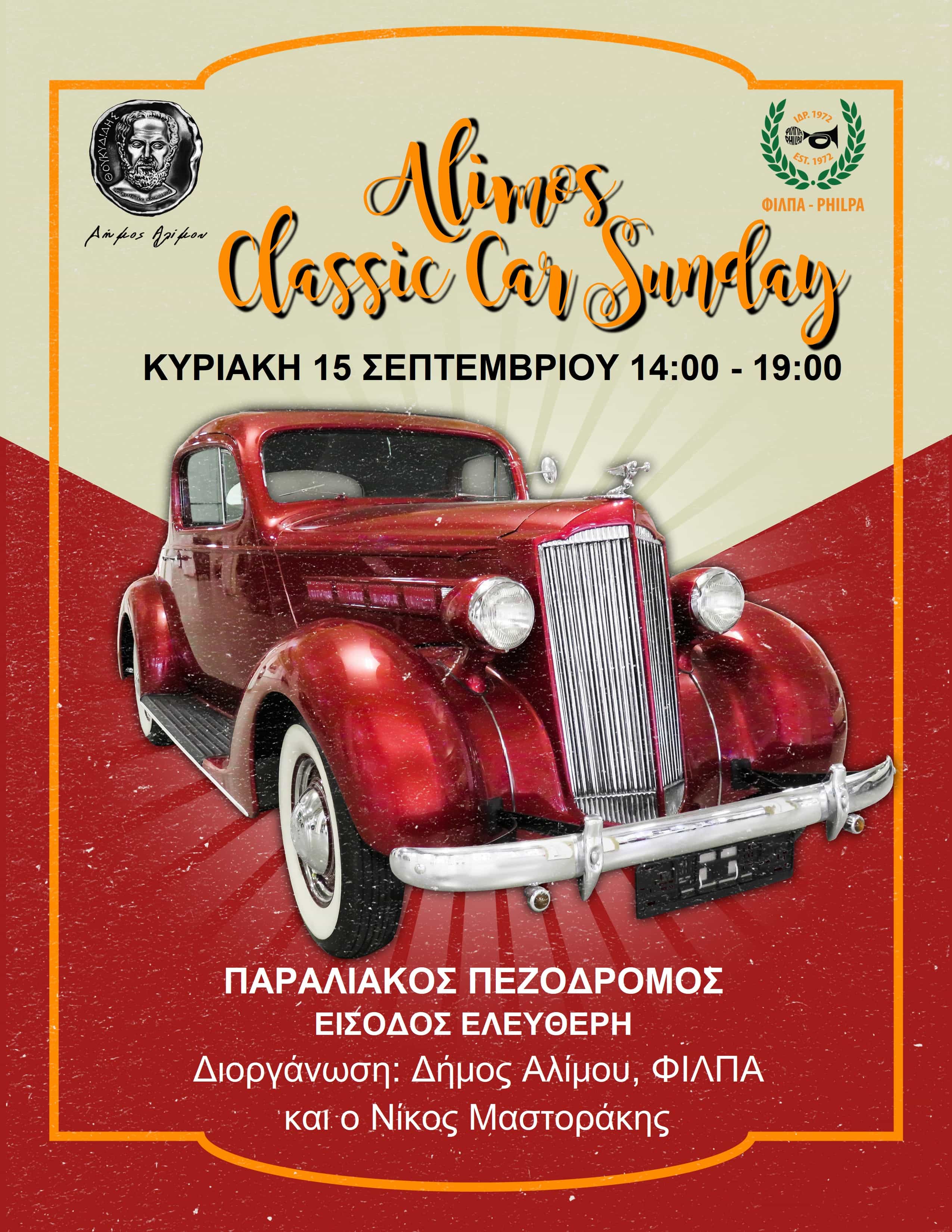 Μια από τις θεαματικότερες εκδηλώσεις της χρονιάς, το Alimos Classic Car Sunday, παρουσιάζει την Κυριακή ο Δήμος Αλίμου, με τη συνεργασία της ΦΙΛΠΑ και του Νίκου Μαστοράκη (δημιουργού του «Ράλλυ Αντίκα» και ιδρυτικού μέλους της ΦΙΛΠΑ.) Περισσότερα από 120 ιστορικά αυτοκίνητα θα εκτεθούν για το κοινό στον μαγευτικό παραλιακό πεζόδρομο, κάτω από το Αττικό φως και με φόντο τη θάλασσα.