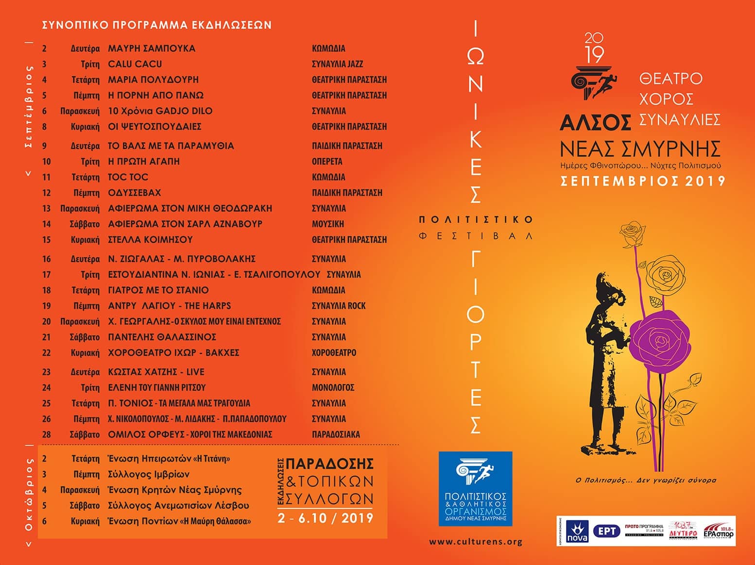 Το μεγαλύτερο ραντεβού πολιτισμού στην Αθήνα δίνει και φέτος ο Πολιτιστικός Οργανισμός του Δήμου Νέας Σμύρνης, με ένα από τα πιο πλούσια προγράμματα στην ιστορία του θεσμού. Οι Ιωνικές Γιορτές ξεκινούν στο Αλσος Νέας Σμύρνης στις 2 Σεπτεμβρίου και ολοκληρώνονται στις 6 Οκτωβρίου, με 30 νύχτες πολιτισμού και καθημερινή εναλλαγή προγράμματος που περιλαμβάνει θεατρικές παραστάσεις, συναυλίες, μουσικά αφιερώματα, παιδικό θέατρο.