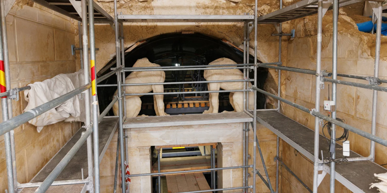 Οι επισκέπτες κατεβαίνουν τα προσωρινά ξύλινα σκαλιά που έχουν στήσει οι συντηρητές, τα οποία οδηγούν προς το εσωτερικό του τάφου και -κατά μία έννοια, προς ένα …μοναδικό ταξίδι στην ιστορία.
