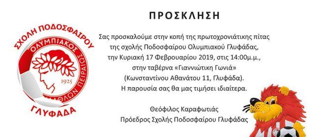 Εκδήλωση για την κοπή της πρωτοχρονιάτικης πίτας, θα πραγματοποιήσει η Σχολή Ποδοσφαίρου Ολυμπιακού Γλυφάδας την Κυριακή, 17 Φεβρουαρίου, και ώρα 2 μ.μ., στην ταβέρνα «Γιαννιώτικη Γωνιά», στη διεύθυνση: Κωνσταντίνου Αθανάτου 11, στην περιοχή της Τερψιθέας, στην Άνω Γλυφάδα.