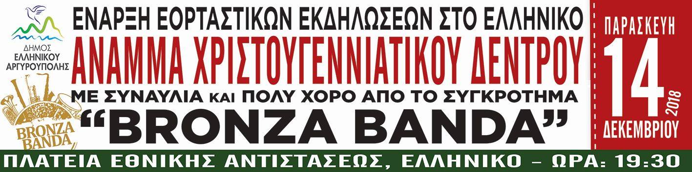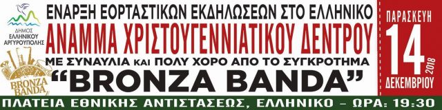 Ώρα 19:30 – 22:00 – Άναμμα Χριστουγεννιάτικου Δέντρου με μουσική συναυλία και χορό στην πλατεία Εθνικής Αντίστασης στο Ελληνικό.