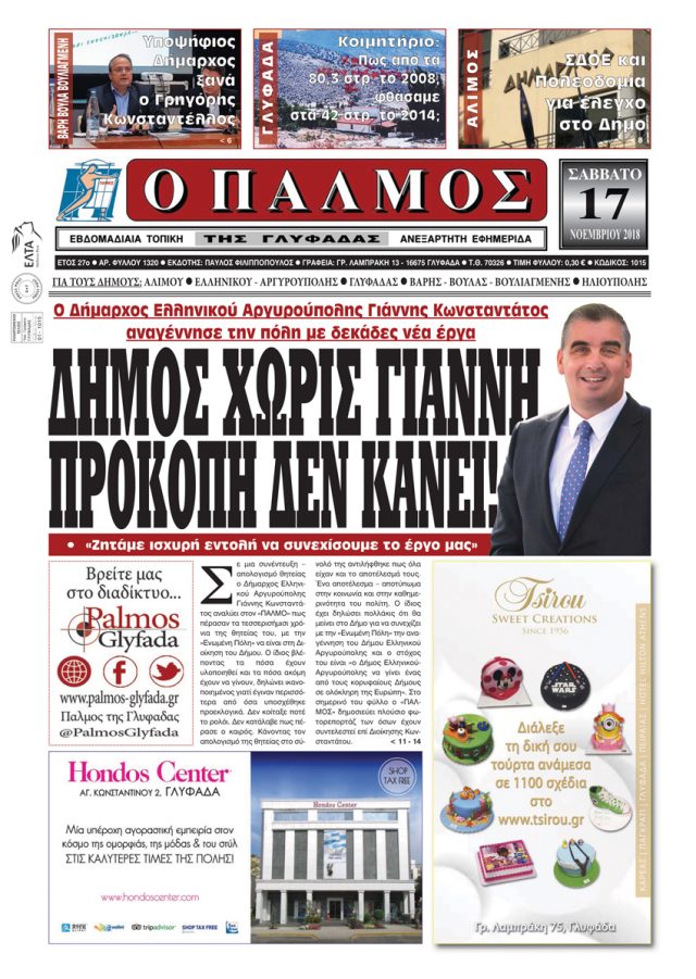 Ευχαριστούμε θερμά τον Γιάννη Κωνσταντάτο Δήμαρχος Ελληνικού Αργυρούπολης για την εμπιστοσύνη του στην ενημέρωση που παρέχει ο Παλμός και για την παραχώρηση της αποκλειστικής συνέντευξης! Στο σημερινό του φύλλο ο «ΠΑΛΜΟΣ» δημοσιεύει και πλούσιο φωτορεπορτάζ των όσων έχουν συντελεστεί επί Διοίκησης Κωνσταντάτου.