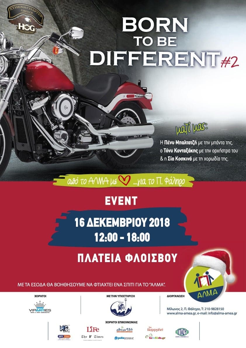Σας περιμένουμε την Κυριακή 16 Δεκεμβρίου 2018 και ώρα 12:00–18:00 στην Πλατεία Φλοίσβου στην εκδήλωση «born to bedifferent» που διοργανώνει ο Πανελλήνιος Σύλλογος Προσαρμοσμένων Δραστηριοτήτων «ΑΛΜΑ» και ο Δήμος Παλαιού Φαλήρου σε συνεργασία με το Σύλλογο μοτοσικλετιστών HOG – ΗΑRLEY OWNERS GROUP