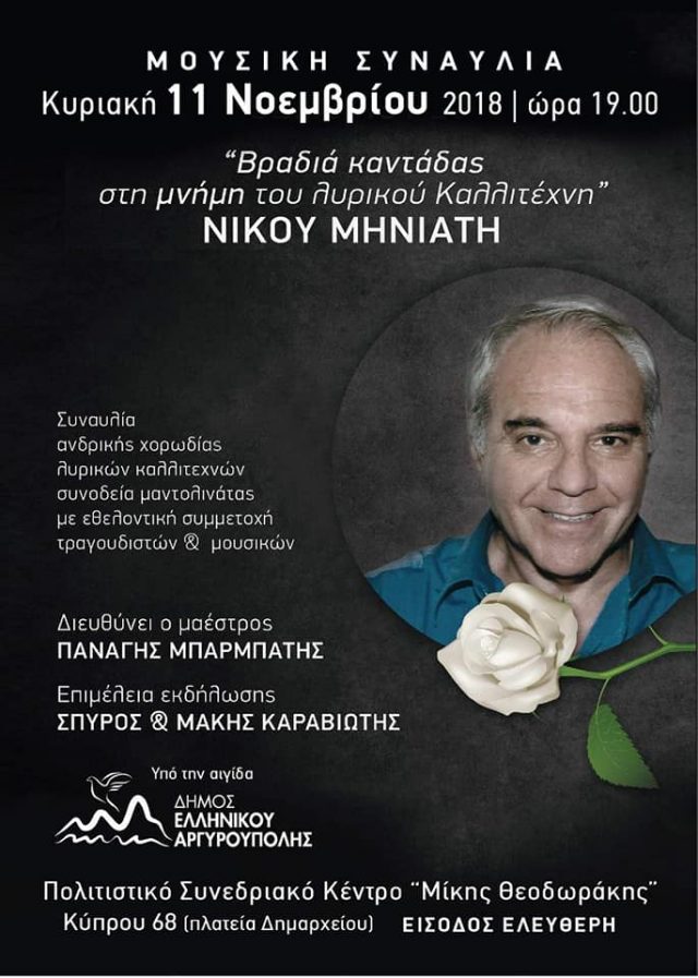 Κυριακή 11 Νοεμβρίου και ώρα 19:00 στο Συνεδριακό Πολιτιστικό Κέντρο «Μίκης Θεοδωράκης» Κύπρου 68, Πλατεία Δημαρχείου Αργυρούπολησ θα λάβει χώρα «Βραδιά Καντάδας» αφιερωμένη στη μνήμη του προσφάτως εκλιπόντος Ληξουριώτη λυρικού καλλιτέχνη Νίκου Μηνιάτη. Είσοδος ελεύθερη