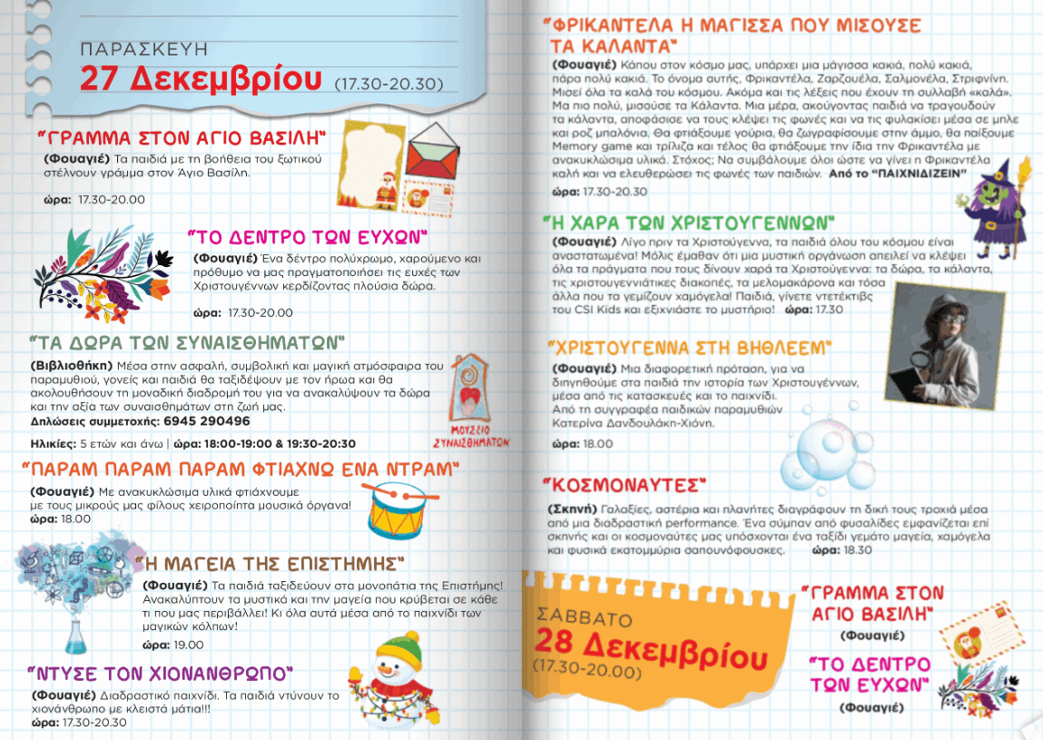 Όλες οι δραστηριότητες θα πραγματοποιηθούν στο Φουαγιέ, στη Σκηνή καθώς και στη Βιβλιοθήκη του Πολιτιστικού – Συνεδριακού Κέντρου «Μίκης Θεοδωράκης».