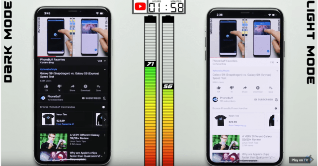 Την απάντηση δίνει το κανάλι PhoneBuff, το οποίο πραγματοποίησε σύγκριση του Dark Mode με το Light Mode του iOS 13 σε ένα iPhone XS Max. Όπως μπορείτε να δείτε και στο video παρακάτω, το Dark Mode έδωσε μια αξιοσημείωτη μεγαλύτερη αυτονομία κατά 30% σε σχέση με το Light Mode!