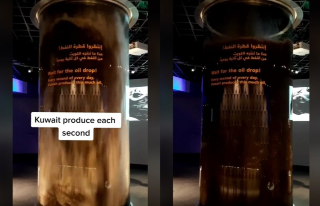 Στο βίντεο φαίνεται ένα μεγάλο δοχείο που βρίσκεται σε μια έκθεση μουσείου στο Κουβέιτ. Το δοχείο γεμίζει ακαριαία αποτυπώνοντας την τεράστια ποσότητα πετρελαίου που παράγεται στο Κουβέιτ κάθε δευτερόλεπτο και υπολογίζεται ότι το πετρέλαιο που χωρά σε ένα τέτοιο δοχείο γεμίζει περί τα 34,6 βαρέλια. Έτσι, τόσα βαρέλια εξορύσσονται κάθε δευτερόλεπτο της ημέρας σε αυτή την χώρα του Κόλπου. Αν σκεφτούμε ότι αυτή τη στιγμή η τιμή του βαρελιού ανέρχεται στα 87 δολάρια, μπορεί εύκολα να υπολογίσει κανείς ότι σε ένα δευτερόλεπτο, το Κουβέιτ κέρδισε περίπου 3.000 δολάρια. Αυτό σημαίνει ότι μόνο σήμερα έβγαλε 259.200.000 δολάρια.