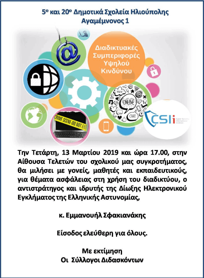 Η ανάγκη ευαισθητοποίησης και ενημέρωσης της εκπαιδευτικής κοινότητας παρουσιάζεται επιτακτική, γι΄αυτό και οι Σύλλογοι Εκπαιδευτικών του 5ου και του 20ου Δημοτικών Σχολείων Ηλιούπολης διοργάνωσαν μια ομιλία-συζήτηση με τον κ. Εμμανουήλ Σφακιανάκη, Αντιστράτηγο και ιδρυτή του Σώματος Δίωξης Ηλεκτρονικού Εγκλήματος της Ελληνικής Αστυνομίας,την Τετάρτη 13 Μαρτίου 2019 και ώρα 17.00,
