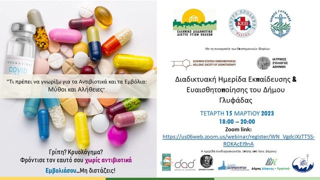 Ο Δήμος Γλυφάδας -μέλος του Ελληνικού Διαδημοτικού Δικτύου Υγιών Πόλεων του Π.Ο.Υ.- και το Ελληνικό Διαδημοτικό Δίκτυο Υγιών Πόλεων, με τη συνεργασία της Ελληνικής Εταιρείας Χημειοθεραπείας, υπό την Αιγίδα του ΙΣΑ, στο πλαίσιο της πανελλήνιας εκστρατείας ενημέρωσης και ευαισθητοποίησης του πληθυσμού για την ορθή χρήση των αντιβιοτικών, διοργανώνει διαδικτυακή ημερίδα με θέμα την αλόγιστη χρήση αντιβιοτικών και τη χρησιμότητα των εμβολίων.