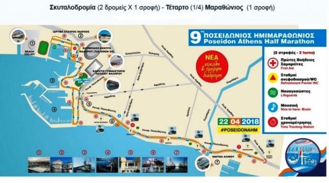 Λόγω διεξαγωγής αγώνα δρόμου με την επωνυμία «9ος Διεθνής Ποσειδώνιος Ημιμαραθώνιος», την Κυριακή 22-4-2018 και ώρες 05.00΄- 13.00΄, θα πραγματοποιηθεί προσωρινή και σταδιακή διακοπή της κυκλοφορίας των οχημάτων στις παρακάτω οδούς περιοχής του Δήμου Παλαιού Φαλήρου, ως εξής: