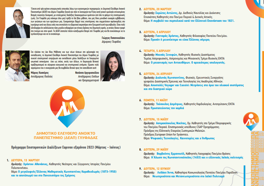 «Στο πλαίσιο της διά βίου μάθησης και των νέων τάσεων στη φιλοσοφία της εκπαίδευσης, το Δημοτικό Ελεύθερο Ανοικτό Πανεπιστήμιο του Δήμου Γλυφάδας, με συνεχή επιστημονική ενημέρωση και εκπαίδευση μέσω διαλέξεων σε διευρυμένα γνωστικά αντικείμενα έχει ως στόχο, εκτός των άλλων, τη δημιουργία θετικού προβληματισμού σε σύγχρονα κοινωνικά και επιστημονικά ζητήματα. Είμαστε πολύ χαρούμενοι που η συνεργασία μας θα συμβάλλει θετικά προς την κατεύθυνση αυτή», τόνισαν ο Αντιδήμαρχος Παιδείας Μάριος Κασσέρης και η Αντιδήμαρχος Εσόδων και Προγραμματισμού Νατάσσα Αργυροπούλου, που έχουν την ευθύνη και τον συντονισμό του εγχειρήματος.