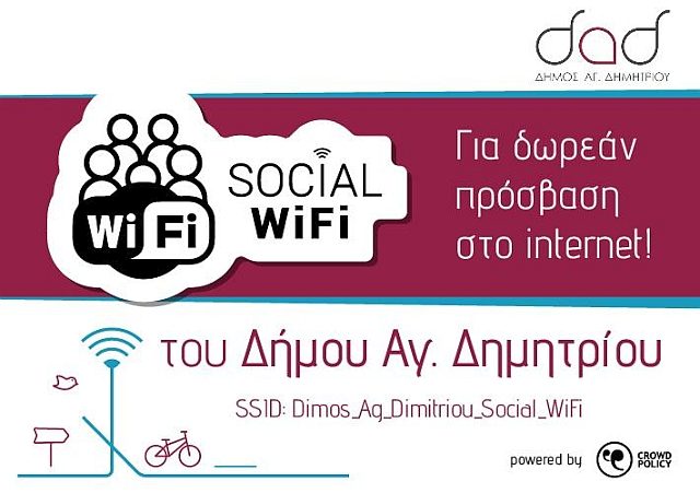Δίκτυο “Social Wi-Fi” για δωρεάν και ελεύθερη πρόσβαση στο Διαδίκτυο από κατοίκους και επισκέπτες, δημιούργησε και επεκτείνει ο Δήμος Αγίου Δημητρίου, ενώ ενεργή συμμετοχή στην επέκταση της κάλυψης του δικτύου στην πόλη μπορούν έχουν οι ίδιοι οι πολίτες.