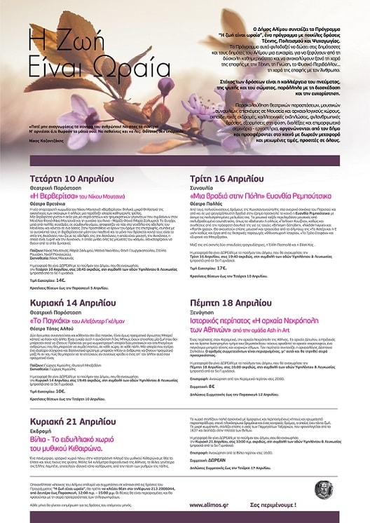 Ο Δήμος Αλίμου συνεχίζει το Πρόγραμμα «Η ζωή είναι ωραία», ένα πρόγραμμα με ποικίλες δράσεις Τέχνης, Πολιτισμού και Ψυχαγωγίας.