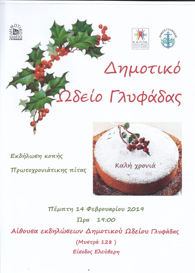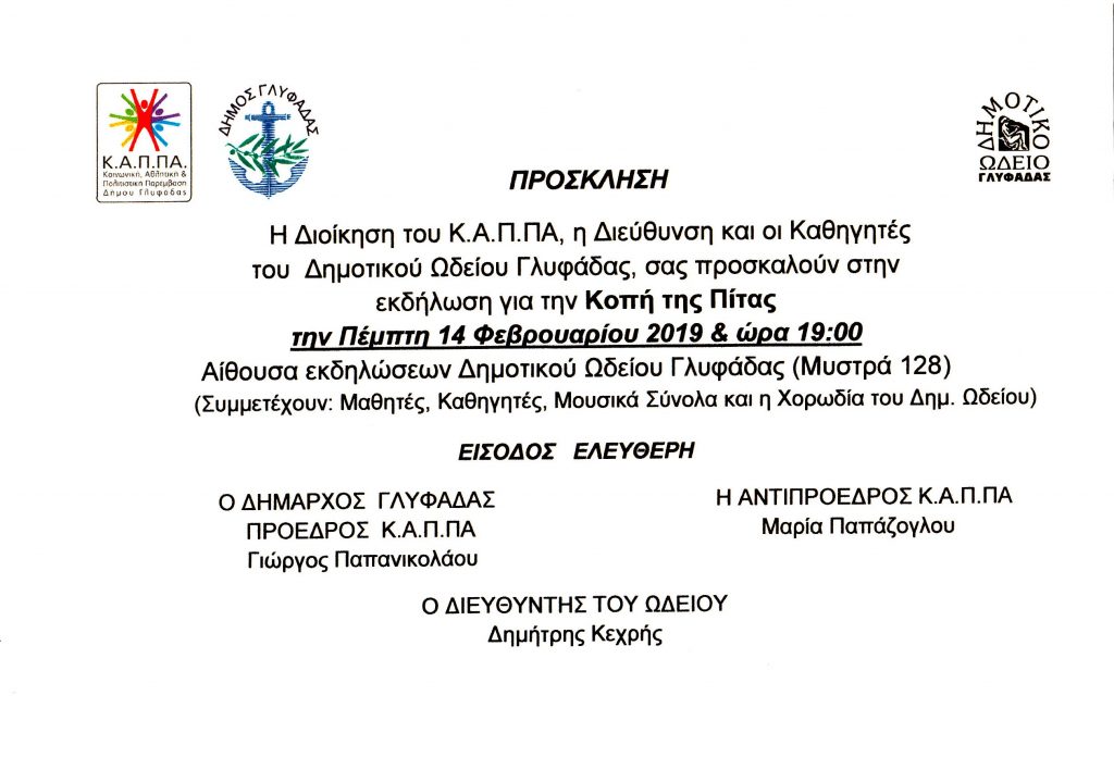 Η Διεύθυνση και οι Καθηγητές του Δημοτικού Ωδείου Γλυφάδας σας προσκαλούν στην εκδήλωση για την κοπή της πίτας στις 14/2/2019 ημέρα Πέμπτη και ώρα 19:00