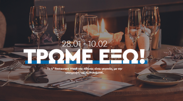 Στο πλαίσιο του 4ου “Dine Athens”, το αθηναϊκό κοινό θα έχει την ευκαιρία να απολαύσει δημιουργίες υψηλής γαστρονομίας σε 120 επιλεγμένα εστιατόρια, σε ειδικές τιμές και με επιπλέον προνόμια για τους κατόχους των καρτών Alpha Bank . Συγκεκριμένα, θα προσφέρονται ειδικά διαμορφωμένα μενού, στις προκαθορισμένες τιμές των 15€, 30€ και 60€ για όλους, ενώ αποκλειστικώς για τους κατόχους καρτών της Alpha Bank θα παρέχεται επιπλέον έκπτωση 10%.
