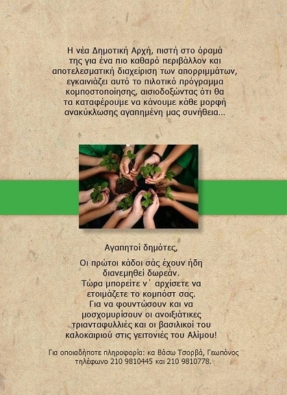 O Δήμος Aλίμου συνεχίζει το πρόγραμμα οικιακής κομποστοποίησης, με νέα δωρεάν διανομή ειδικών οικιακών Κάδων Κομποστοποίησης.