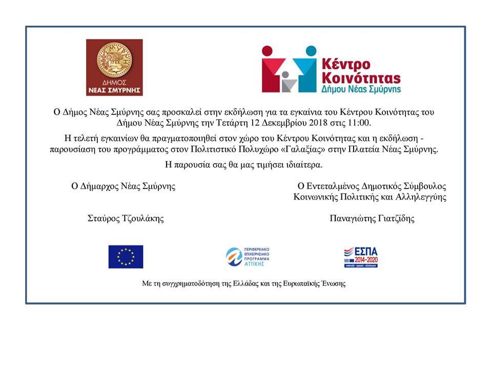 Εγκαίνια του Κέντρου κοινότητας Νέας Σμύρνης – Πληροφορίες για τη λειτουργία και τη δομή του