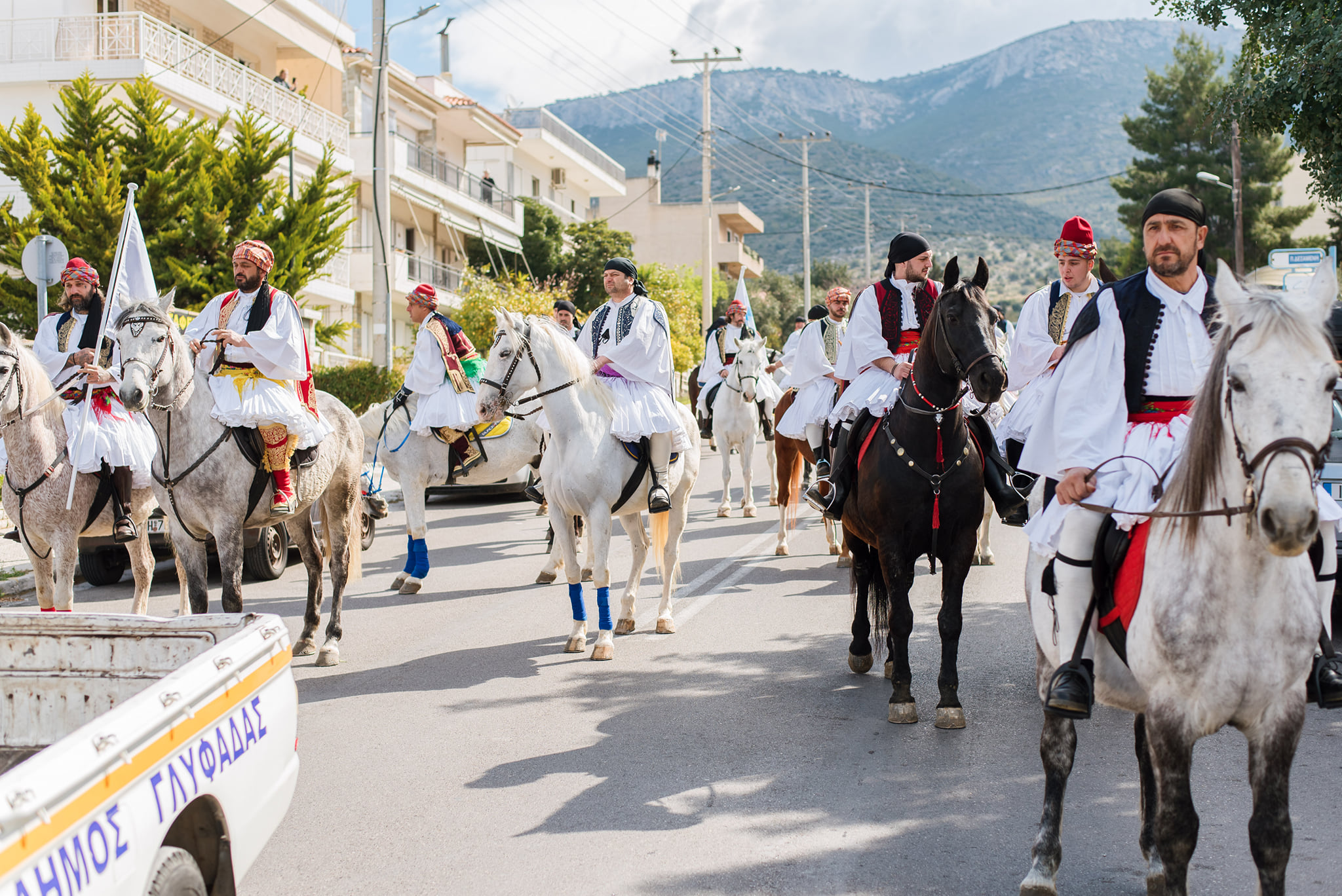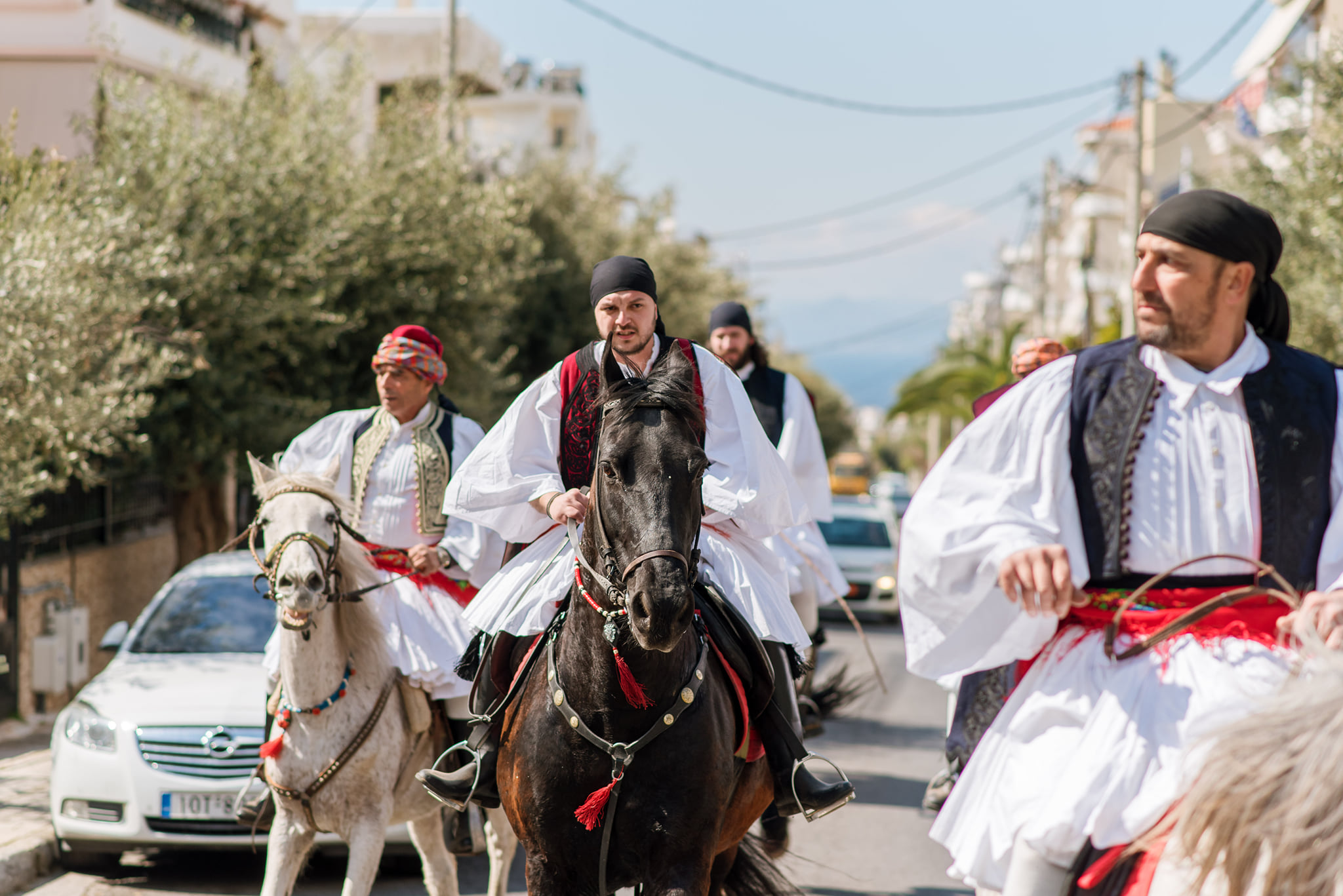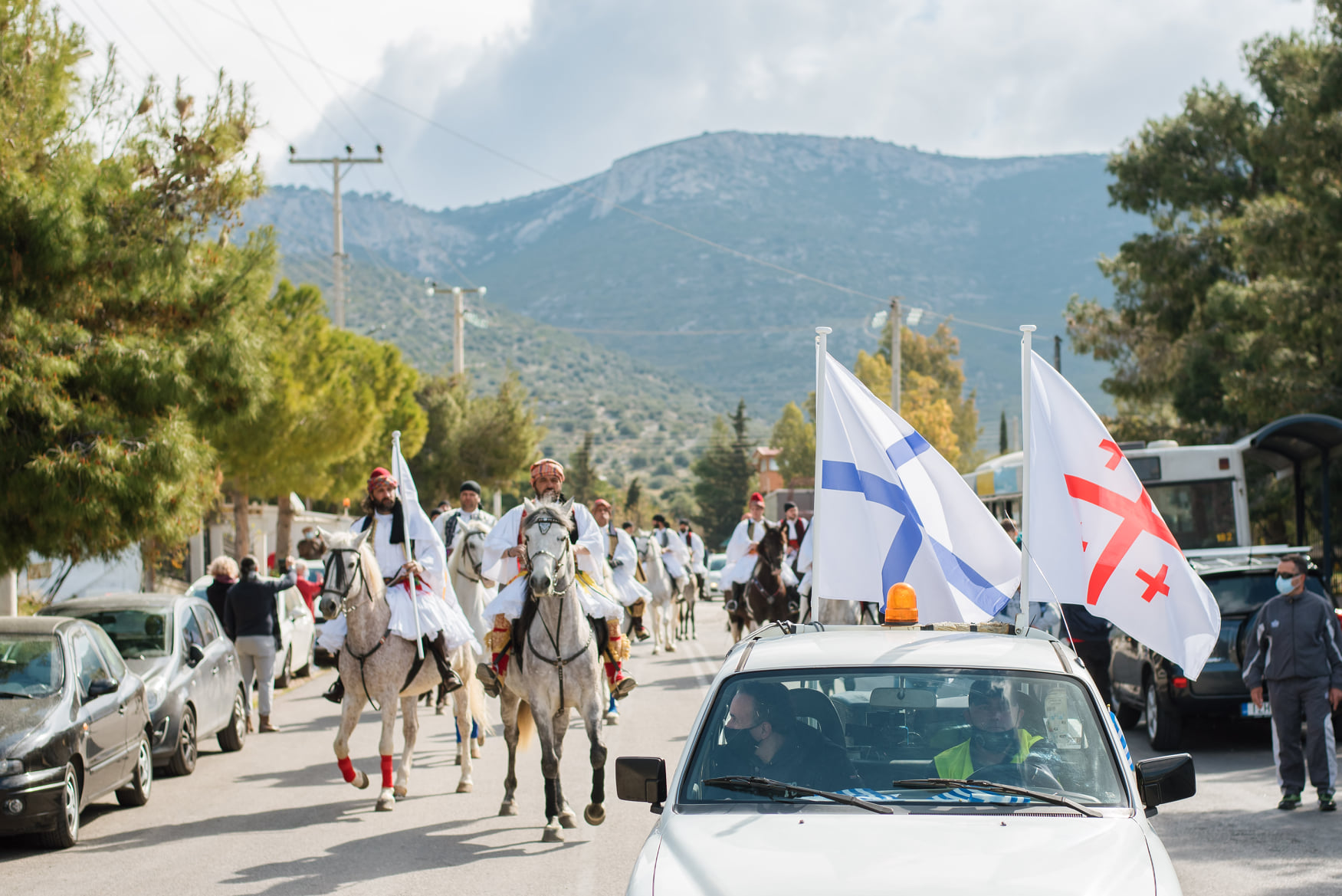 Εικοσιένας έφιπποι με λάβαρα, παραδοσιακές φορεσιές και τραγούδια στους δρόμους της Γλυφάδας – με μεγαλοπρέπεια ο εορτασμός των 200 χρόνων από την Εθνική Παλιγγενεσία.