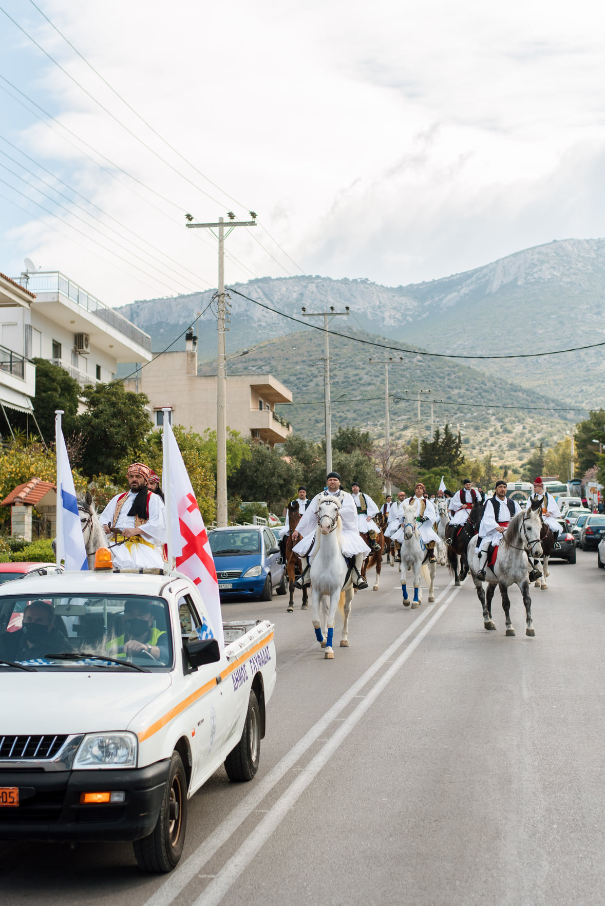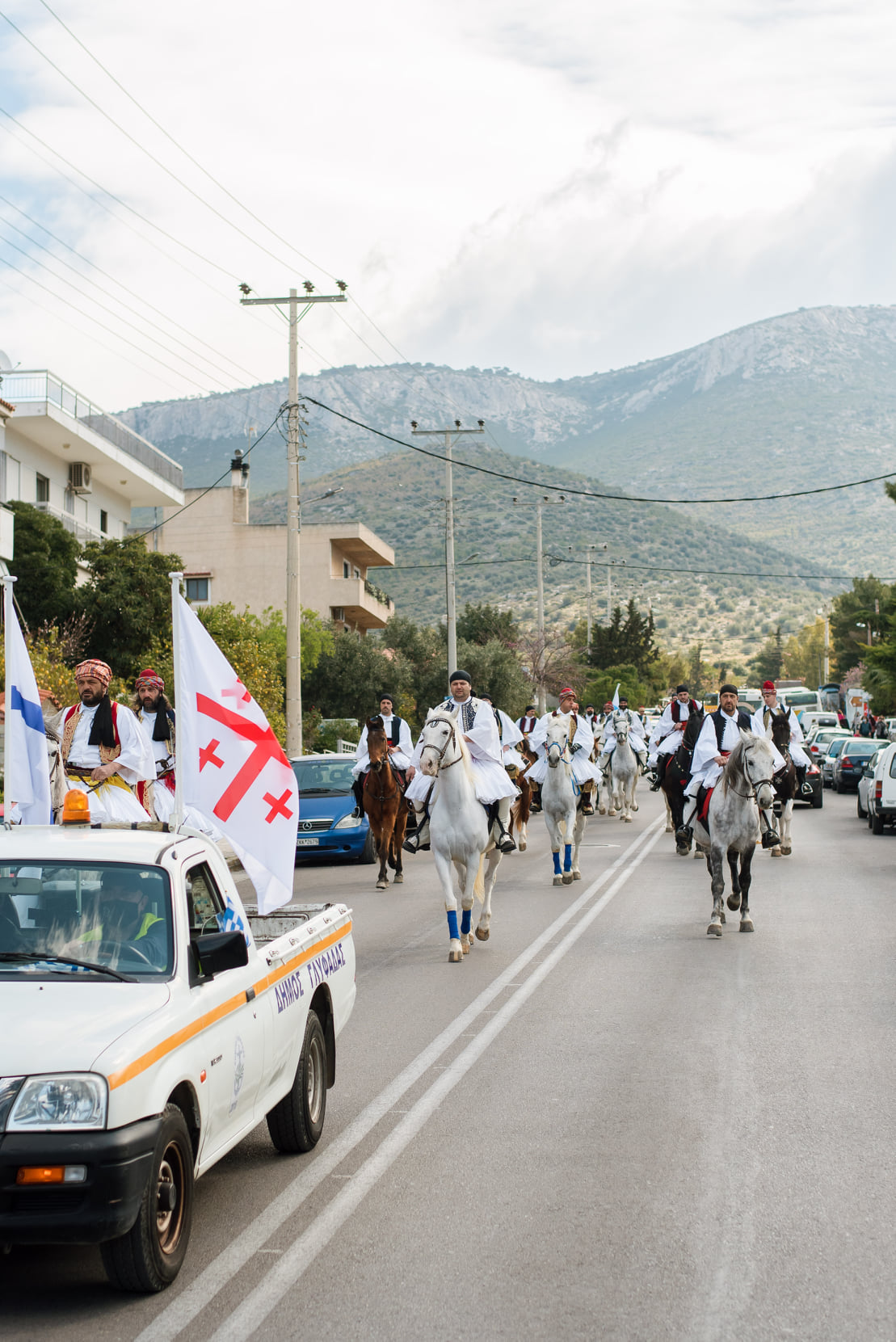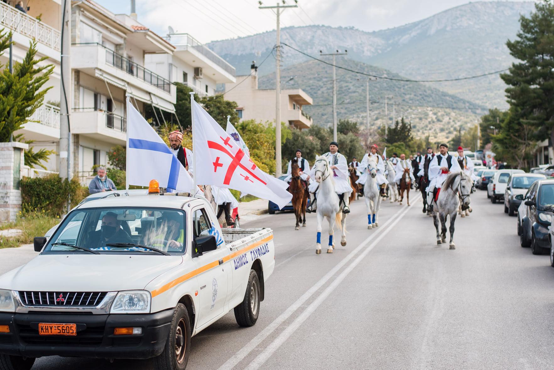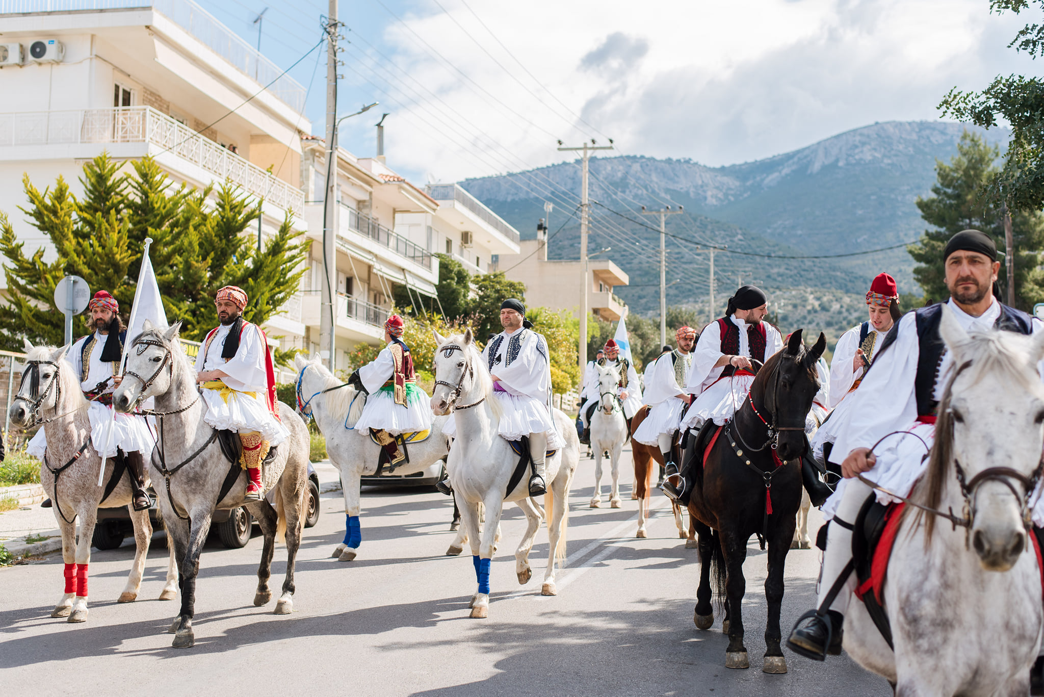 Εικοσιένας έφιπποι με λάβαρα, παραδοσιακές φορεσιές και τραγούδια στους δρόμους της Γλυφάδας – με μεγαλοπρέπεια ο εορτασμός των 200 χρόνων από την Εθνική Παλιγγενεσία.