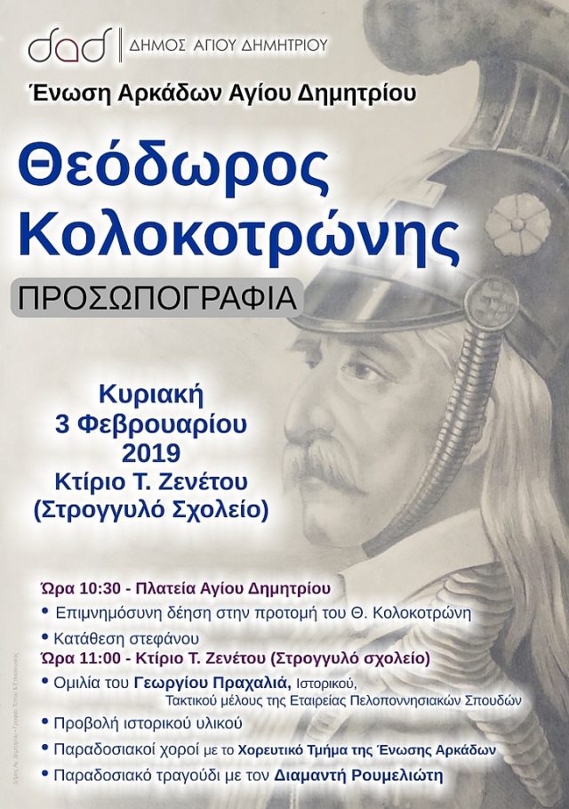 Ο Δήμος και η Ένωση Αρκάδων Αγίου Δημητρίου, σας προσκαλούν στην εκδήλωση ιστορικής μνήμης «Θεόδωρος Κολοκοτρώνης – Προσωπογραφία», που διοργανώνουν την Κυριακή 3 Φεβρουαρίου 2019, σύμφωνα με το πρόγραμμα που ακολουθεί: