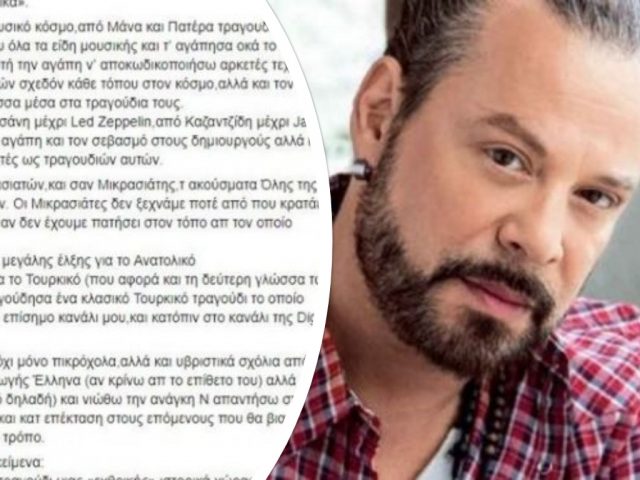 “Το παρακάτω post ενδέχεται για πολλούς να είναι shocking και ζήτω συγνώμη προκαταβολικά». Μεγάλωσα σ’ έναν μουσικό κόσμο,από Μάνα και Πατέρα τραγουδιστές. Μελέτησα στη ζωή μου όλα τα είδη μουσικής και τ’ αγάπησα οκά το ίδιο. Κατάφερα μέσα απ αυτή την αγάπη ν’ αποκωδικοποιήσω αρκετές τεχνικές έκφρασης των μελωδιών σχεδόν κάθε τόπου στον κόσμο,αλλά και τον τρόπο που εκφέρουν τη γλώσσα μέσα στα τραγούδια τους. Τραγούδησα από Τσιτσάνη μέχρι Led Zeppelin,από Καζαντζίδη μέχρι James Brown με όλη μου την αγάπη και τον σεβασμό στους δημιουργούς αλλά και τους αρχικούς εκτελεστές ως τραγουδιών αυτών. Είμαι απόγονος Μικρασιατών,και σαν Μικρασιάτης,τ ακούσματα Όλης της Ανατολής με συγκινούν. Οι Μικρασιάτες δεν ξεχνάμε ποτέ από που κρατάει η σκούφια μας,ακόμα κι αν δεν έχουμε πατήσει στον τόπο απ τον οποίο ερχόμαστε. Στα πλαίσια αυτής της μεγάλης έλξης για το Ανατολικό τραγούδι,συγκεκριμένα το Τουρκικό (που αφορά και τη δεύτερη γλώσσα των Παππούδων μας) τραγούδησα ένα κλασικό Τουρκικό τραγούδι το οποίο «ανέβηκε» πρώτα στο επίσημο κανάλι μου,και κατόπιν στο κανάλι της Digital Ray. Σήμερα δέχθηκα δυο όχι μόνο πικρόχολα,αλλά και υβριστικά σχόλια από έναν Αρμενικής καταγωγής Έλληνα (αν κρίνω απ το επίθετο του) αλλά κι έναν Κυπραίο (αδελφό δηλαδή) και νιώθω την ανάγκη Ν απαντήσω στους συγκεκριμένους αλλά και κατ επέκταση στους επόμενους που θα βιαστούν να βρίσουν με τον ίδιο τρόπο. Ακούστε ποταπά υποκείμενα: Τ’ ότι τραγουδάω ένα τραγούδι μιας «εχθρικής» ιστορικά χώρας,δε με κάνει «Τουρκοσπορο»,ούτε προδότη. Το τραγουδάω με την ίδια αγάπη και προσέγγιση όπως κι όταν τραγούδησα άλλες γλώσσες,άλλων λαών,επίσης «αλλόθρησκων»,αφού κι οι ευρωπαίοι ή οι αμερικανοί,ανήκουν και πιστεύουν σε αλλά δόγματα απ το δικό μας. Σε κάθε περίπτωση,αν θέλετε να με βρίσετε είναι καλύτερα να μην το κάνετε πίσω από ένα τερματικό,αλλά πρόσωπο με πρόσωπο,κι όχι με τέτοια δειλία και «ημιεπωνυμα» και καλό είναι να έρθετε με κάποιον μαζί,ίσως με τον Μπαμπά σας για να μη γαμ@@@ μόνο εσάς…μ@@@ια της Λάσπης! Α! Κι επειδή το Μότο στη ζωή μου είναι το «Οφθαλμον αντί Οφθαλμού»,εφ όσον με βρίσατε,έχω Ν απαντήσω. ΤΟ ΣΠΙΤΙ ΣΑΣ!! Θα τραγουδάω ότι μ’ εκφράζει κι ότι αναστρέφει τη ροή του αιματος μου