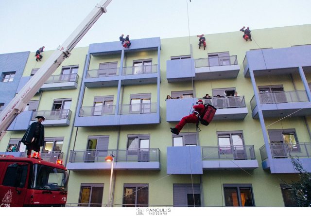 Ταυτόχρονα, άνδρες της ΕΜΑΚ με σχοινιά ξεκίνησαν να κατεβαίνουν από την οροφή του κτηρίου, σταματώντας στα μπαλκόνια των παιδιών τα οποία δεν μπορούσαν να κατέβουν στον προαύλιο χώρο προκειμένου να ειδοποιήσουν για την άφιξη του Άγιου Βασίλη, να τους δώσουν τα δώρα τους και να τους ευχηθούν «Καλή ανάρρωση» και «Καλές Γιορτές».