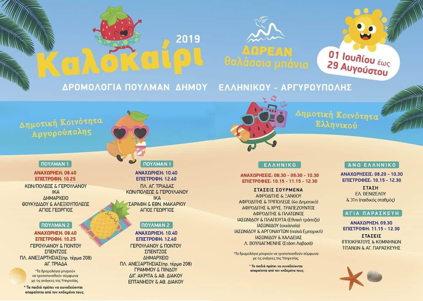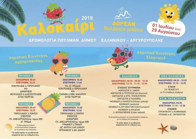 Από την 1 Ιουλίου έως 29 Αυγούστου τα πούλμαν του Δήμου μας, από Δευτέρα έως Παρασκευή, θα μεταφέρουν οργανωμένα τους κατοίκους της πόλης μας στην παραλία Ελληνικού.