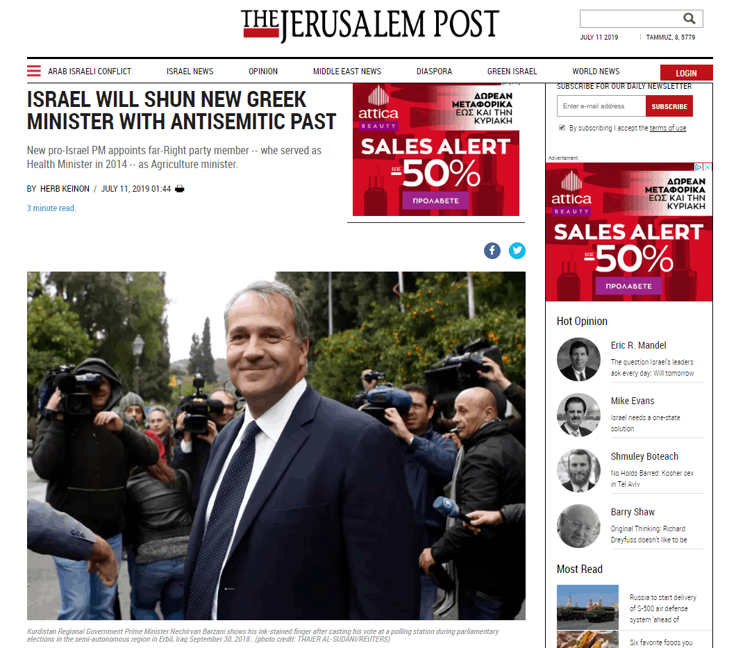 Το ρεπορτάζ περιγράφει τον Μητσοτάκη ως ένα φιλοισραηλινό πολιτικό, τον οποίο συνεχάρη μετά την εκλογική νίκη του ο επικεφαλής του παγκόσμιου Εβραικού κογκρέσου Ρόναλτ Λόντερ: «Είναι πραγματικό φίλος του Ισραήλ και έχει επιδείξει πραγματική υποστήριξη και φιλία απέναντι στην εβραϊκή κοινότητα της Ελλάδος».