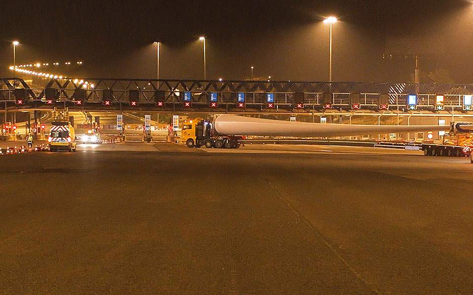 Μια μεγάλη επιχείρηση μεταφοράς πτερυγίων ανεμογεννητριών από το Λαύριο στην Θήβα είναι σε εξέλιξη τις νυχτερινές ώρες την τρέχουσα και την επόμενη εβδομάδα, μέσω της Ολυμπίας Οδού.