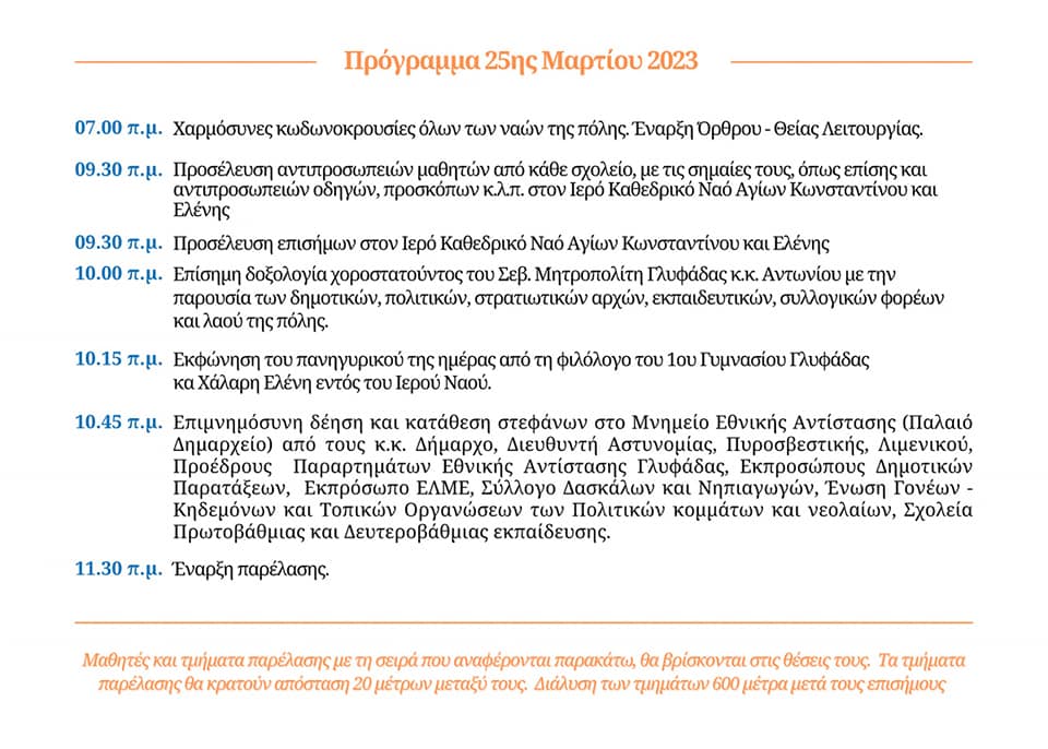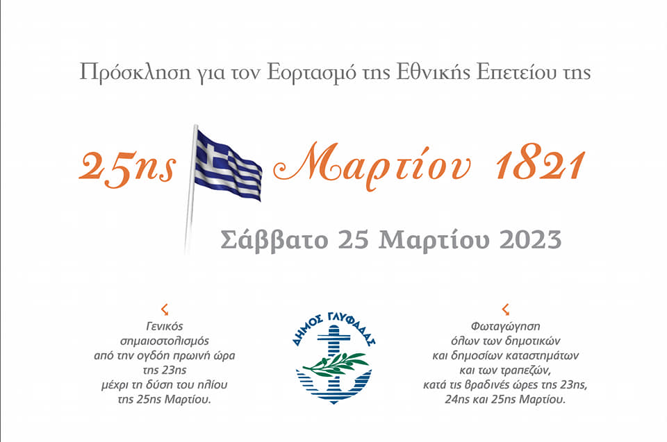 Οι Δήμοι μαςΓλυφάδαΕορτασμός εθνικής Επετείου 25ης Μαρτίου στο Δήμο ΓλυφάδαςΑπό Oi Notioi - 23 Μαρτίου 2023FacebookTwitterWhatsAppLinkedinEmailΤυπώνωTelegramViber Ο Δήμαρχος Γλυφάδας Γιώργος Παπανικολάου και το Δημοτικό Συμβούλιο σας προσκαλούν στις εκδηλώσεις για τον εορτασμό της Εθνικής Επετείου της 25ης Μαρτίου 1821 στο Δήμο Γλυφάδας.