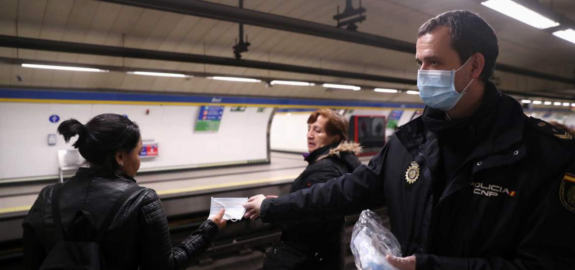 Σήμερα, Ισπανοί αστυνομικοί μοίραζαν μάσκες στο Μετρό, καθώς εργάτες σε εργοστάσια και οικοδομές επέστρεψαν σήμερα στην εργασία τους.