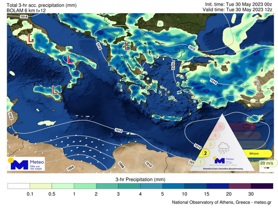 Στους προγνωστικούς χάρτες, αποτυπώνεται η γεωγραφική κατανομή των φαινομένων τα τρίωρα 12:00 – 15:00 και 21:00 – 24:00 (ώρα Ελλάδας) της Τρίτης 30/05: