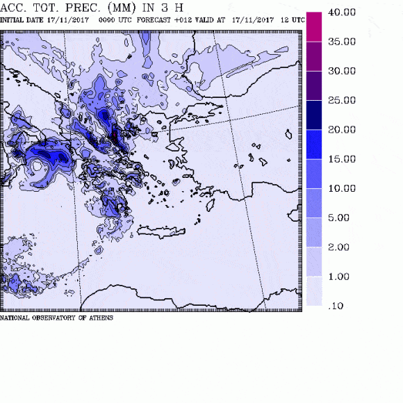 Ο παρακάτω χάρτης παρουσιάζει τις βροχές που προβλέπονται το μεσημέρι της Παρασκευής 17/11 στη χώρα μας.