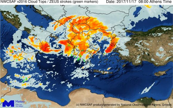 Η Ευρυδίκη συνεχίζει να επηρεάζει τη χώρα μας, δίνοντας την Παρασκευή 17/11, από τις πρωινές ώρες, ισχυρά φαινόμενα (βροχές και καταιγίδες) σε μεγάλο μέρος της ηπειρωτικής χώρας. Τα ισχυρά φαινόμενα κατά τη διάρκεια της ημέρας θα επηρεάσουν περιοχές της Κεντρικής και Δυτικής Μακεδονίας και της Θεσσαλίας, ενώ βροχές αναμένονται και σε περιοχές της Στερεάς Ελλάδας και της Πελοποννήσου. Βροχές και καταιγίδες αναμένονται και στην Αττική. Μέχρι το βράδυ καταιγίδες αναμένονται και στο Αιγαίο, περισσότερο έντονες στα βόρεια τμήματα του.