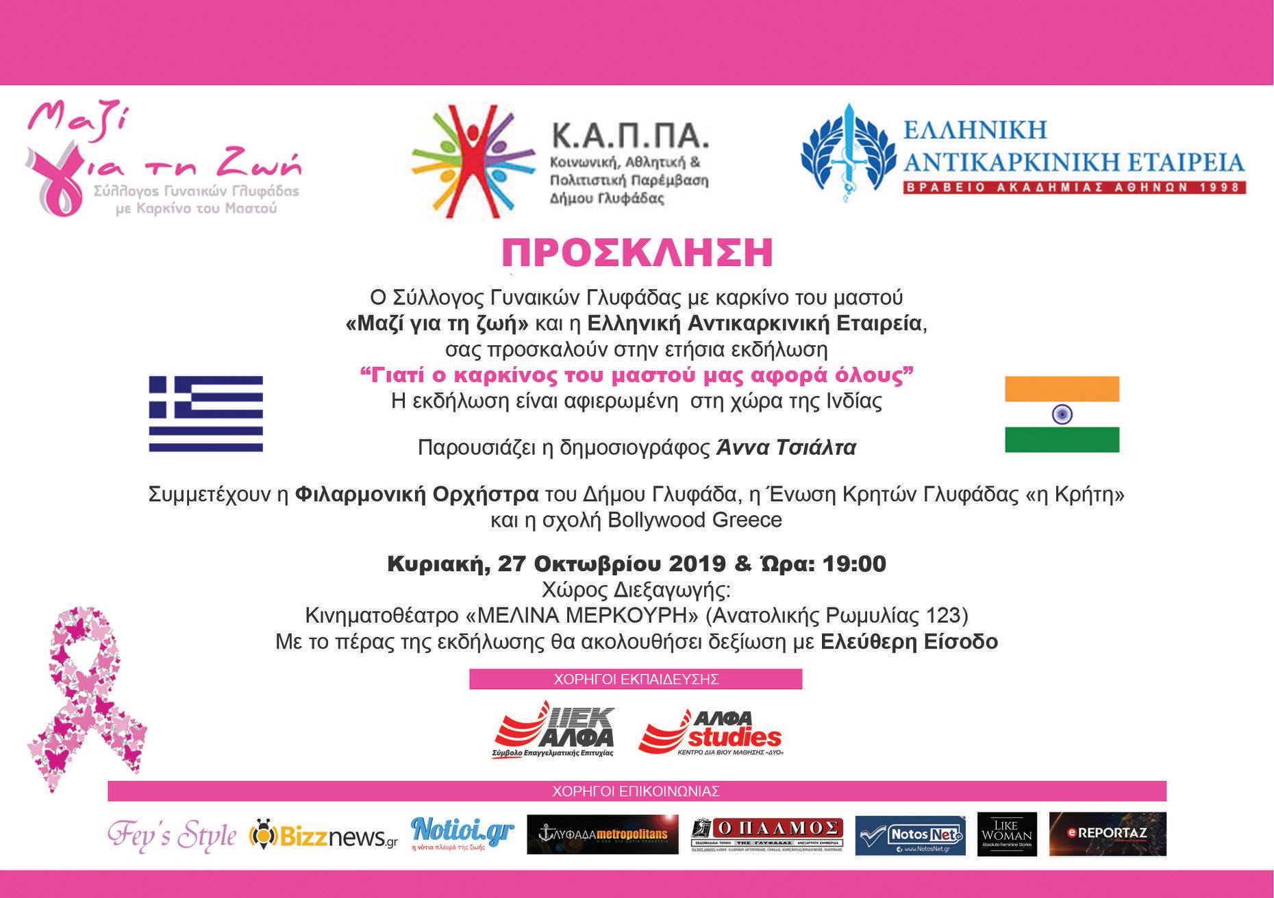 Ο Σύλλογος Γυναικών Γλυφάδας με καρκίνο του μαστού «Μαζί για την ζωή» και η Ελληνική Αντικαρκινική Εταιρεία σας προσκαλούν στην ετήσια εκδήλωση “Γιατί ο καρκίνος του μαστού μας αφορά όλους”