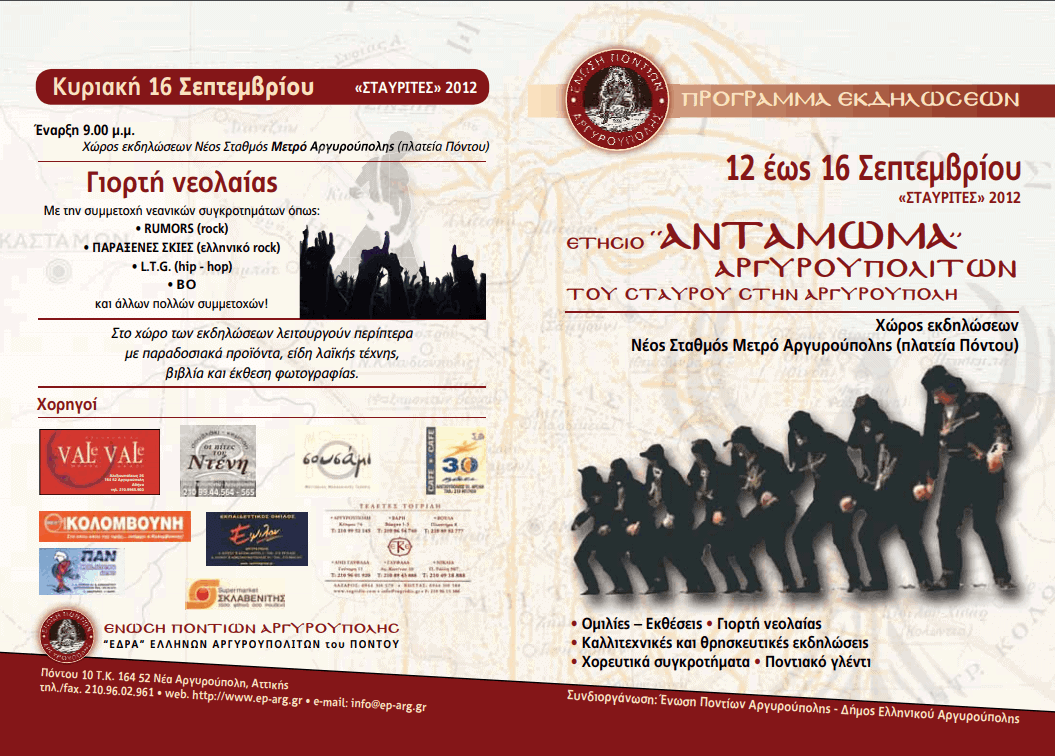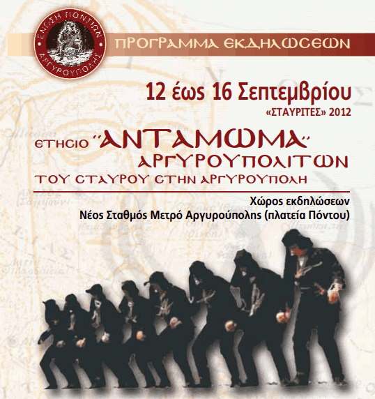 Η Ένωση Ποντίων Αργυρούπολης σας προσκαλεί στο Ετήσιο Αντάμωμα Αργυρουπολιτών που θα πραγματοποιηθεί από τις 12 έως τις 16 Σεπτεμβρίου στην πλατεία Πόντου.