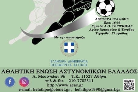 Φιλανθρωπικός ποδοσφαιρικός αγώνας θα πραγματοποιηθεί σήμερα, Δευτέρα, 17 Δεκεμβρίου, στο γήπεδο της Τερψιθέας Γλυφάδας, με ώρα έναρξης τις 16:30, ανάμεσα στην Αθλητική Ένωση Αστυνομικών Ελλάδας και στον Αθλητικό Όμιλο Τερψιθέας Γλυφάδας.