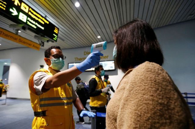 Health Quarantine officer checks people with a thermal scanner after Indonesia confirmed its first cases of coronavirus disease (COVID-19), in Soekarno Hatta International Airport, in Tangerang near Jakarta, Indonesia, March 6, 2020. REUTERS/Ajeng Dinar Ulfiana