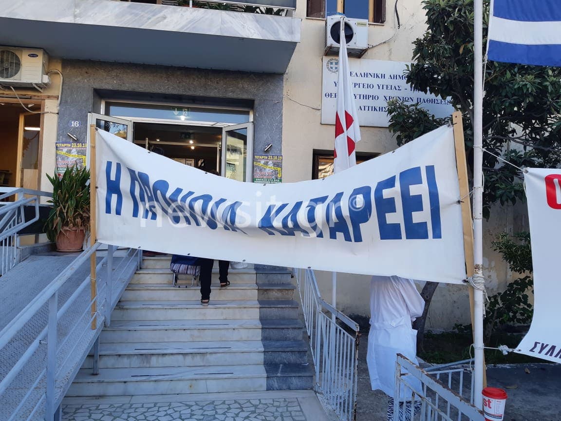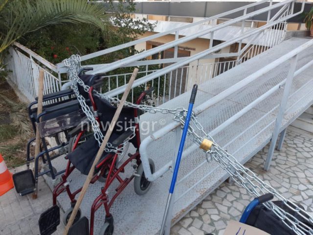 Παρουσία και εκπροσώπων της ΠΟΕΔΗΝ, οι εργαζόμενοι έκλεισαν με αλυσίδες την είσοδο του κτιρίου όπου φιλοξενείται το κέντρο. Έδεσαν δυο αναπηρικά καροτσάκια, πάνω στα οποία είχαν βάλει αυγά και… ντομάτες. Οι εργαζόμενοι ζήτησαν από το ΕΚΑΒ, που είχε πάει στο σημείο για να παραλάβει τους τρόφιμους, να αποχωρήσει, με τους εργαζόμενους να διαμηνύουν πως δεν θα τους επέτρεπαν να μπουν στο κτίριο.