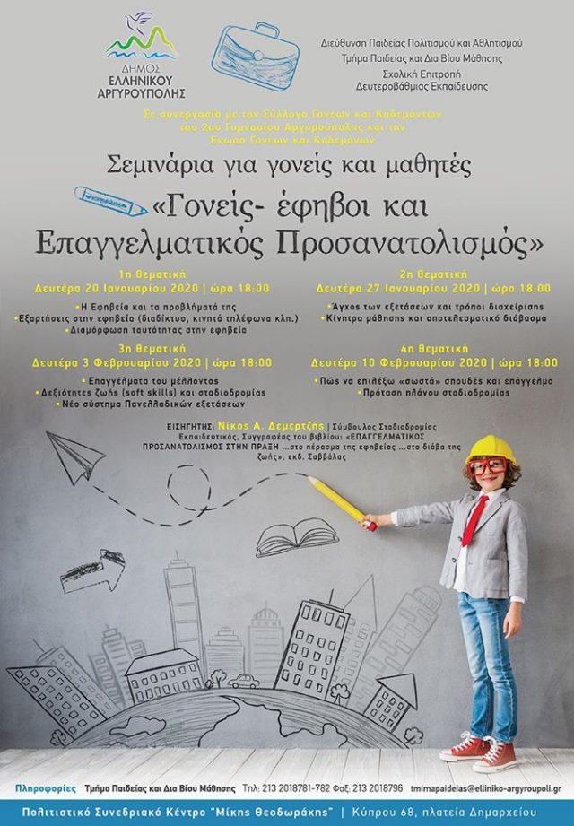 Ο Δήμος Ελληνικού-Αργυρούπολης , η Δ/νση Παιδείας, Πολιτισμού και Αθλητισμού, το Τμήμα Παιδείας και Δια Βίου Μάθησης οργανώνει σε συνεργασία με τον Σύλλογο του 2ου Γυμνασίου Αργυρούπολης και την ΄Ενωση Γονέων και Κηδεμόνων κύκλο σεμιναρίων για γονείς και μαθητές με τον τίτλο: